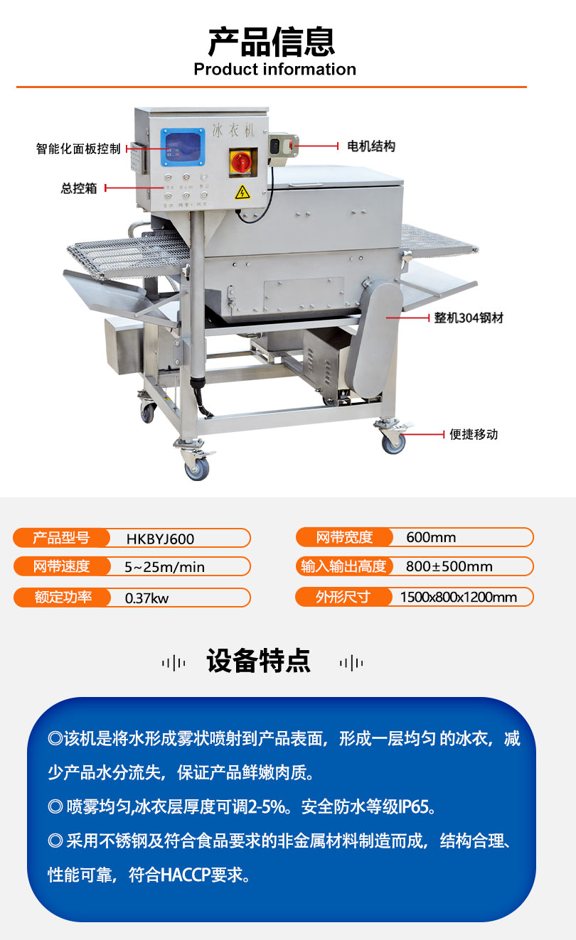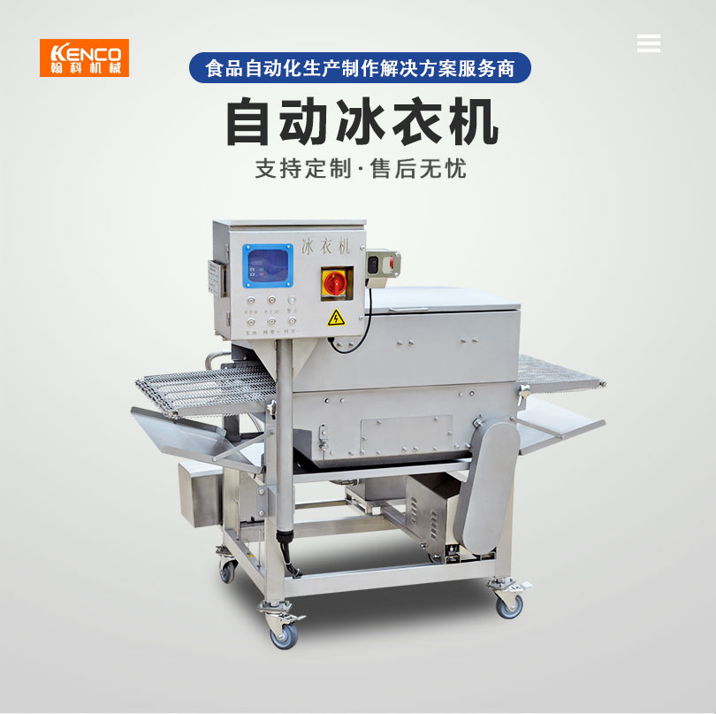 冰衣机是将水形成雾状喷射到产品表面,形成一层均匀的冰衣,减少产品水分流失,保证产品鲜嫩肉质。