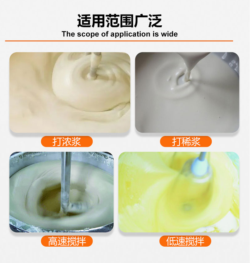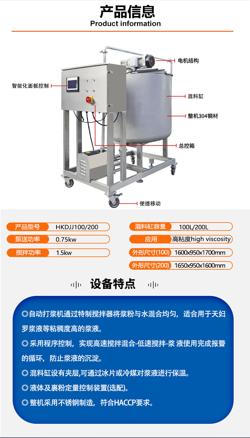 HKDJJ200打浆机通过特制搅拌器将浆粉与水混合均匀,适合用于天妇罗浆液等粘稠度高的浆液。