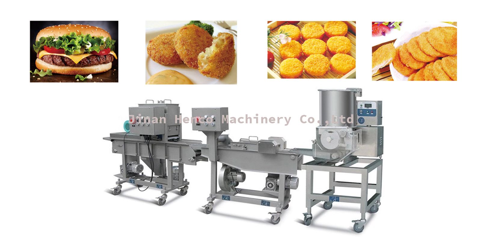 成型机:全自动肉饼成型机能自动完成馅料的充填、成型、输出等工序。通过更换不同的模具可以生产不同形状(圆形、方形、椭圆形、三角形、心形及其它特殊形状)的产品。