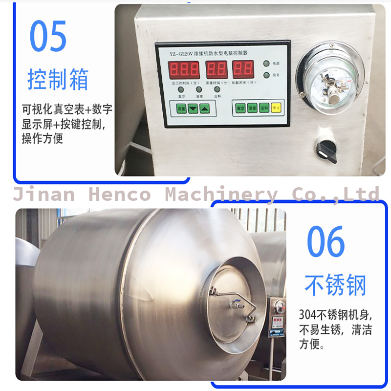 真空滚揉机是在真空状态下,利用物理冲击原理,让肉在滚筒内上下翻动、相互撞击,从而产生均匀分布的摩擦、腌制作用。