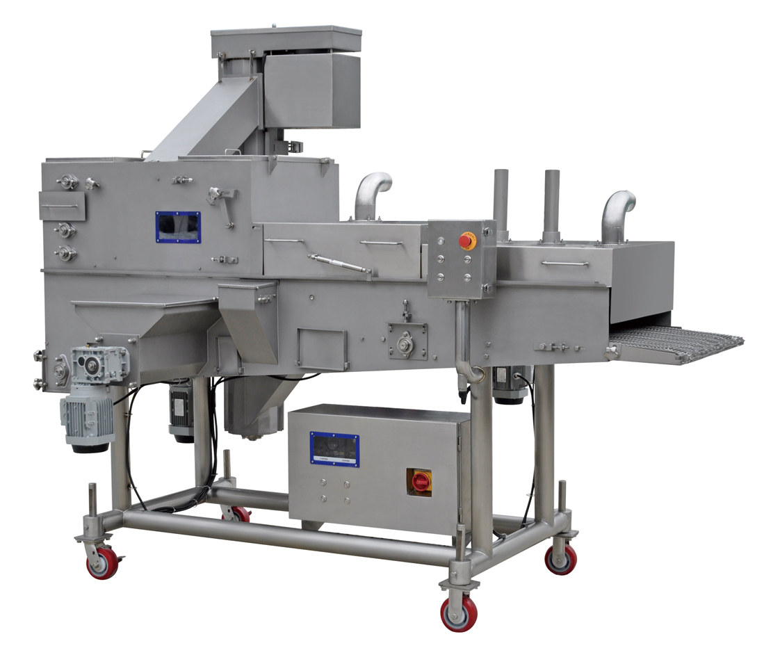 HKSFJ400 preduater is specially designed for coating food processing, it coats the bottom of the products by the layer of the flour on the conveyor belt, it coats the surface of the products by the unique belt pouring the flour evenly to the passing products on the belt. This can ensure the coating evenly, equally, and the coating quantity is controlled.